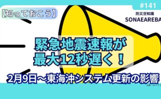 防災豆知識緊急地震速報が最大12秒遅く!2月9日〜東海沖システム更新の影響 【速報】東海沖地震速報12秒遅延の理由は機器更新。2/9〜1カ月要注意エリアと行動指針を徹底ガイド。南海トラフ備えに直結! 2026.02.04防災豆知識