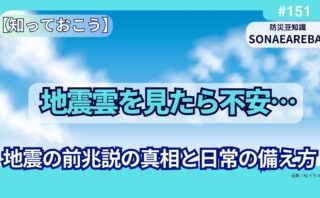 防災豆知識地震雲を見たら不安…地震の前兆説の真相と日常の備え方 「地震雲」は本当に地震の前兆なのでしょうか? 本記事では、防災専門ライターが最新の科学的根拠と心理的背景をわかりやすく解説。不安に振り回されないための考え方と、今すぐできる地震への備え方を紹介します。 2026.03.18防災豆知識